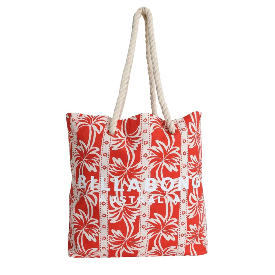 The Billabong Row Of Palms Beach Bag Red Aloha is a womens beach bag. It is the perfect beach bag for sunny days by the water. It has a fun print, a zip internal pocket, and a coated inside and outside to help keep your things dry. This bag is roomy enough to carry all your beach or pool day essentials, like towels, snacks, and sunscreen. Easy to carry and made to handle long days in the sun, this bag is a great pick for anyone who loves summer and the surf lifestyle.