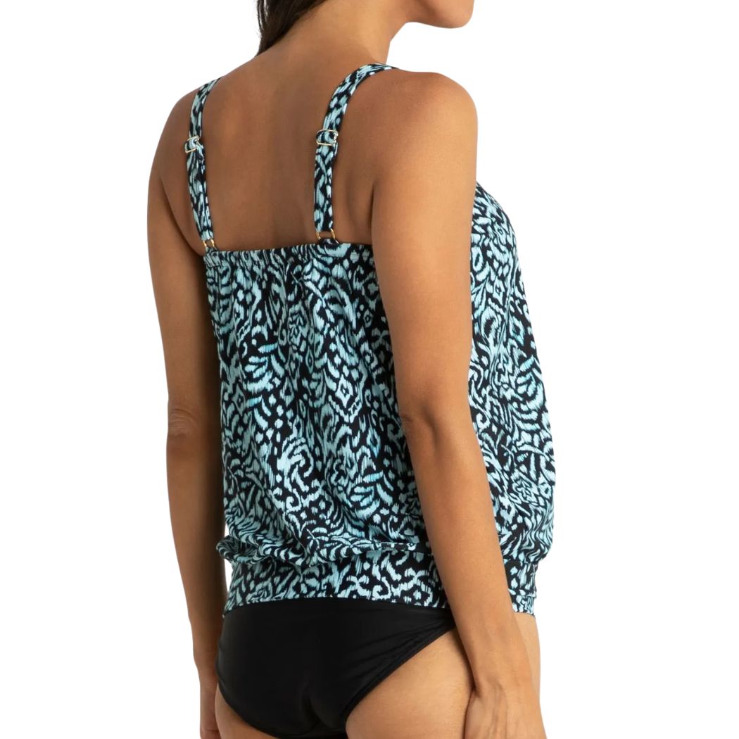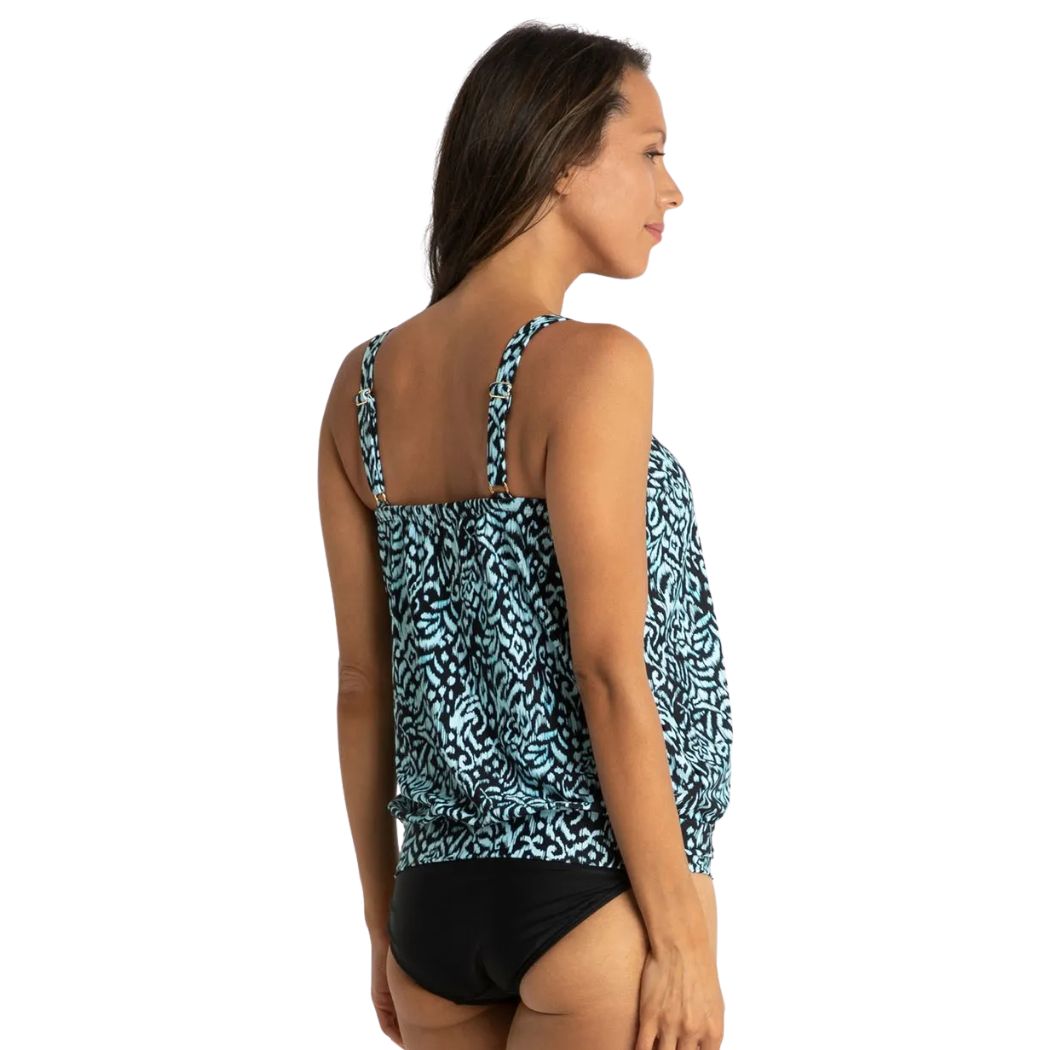 The Jantzen Select Blouson 2pc Black is a two piece swimwear set. A full blouson swim top has fixed soft bra cups, powermesh shelf bra and an elastic neckline. Soft flowy and pretty. Comes with a full Jantzen pant.