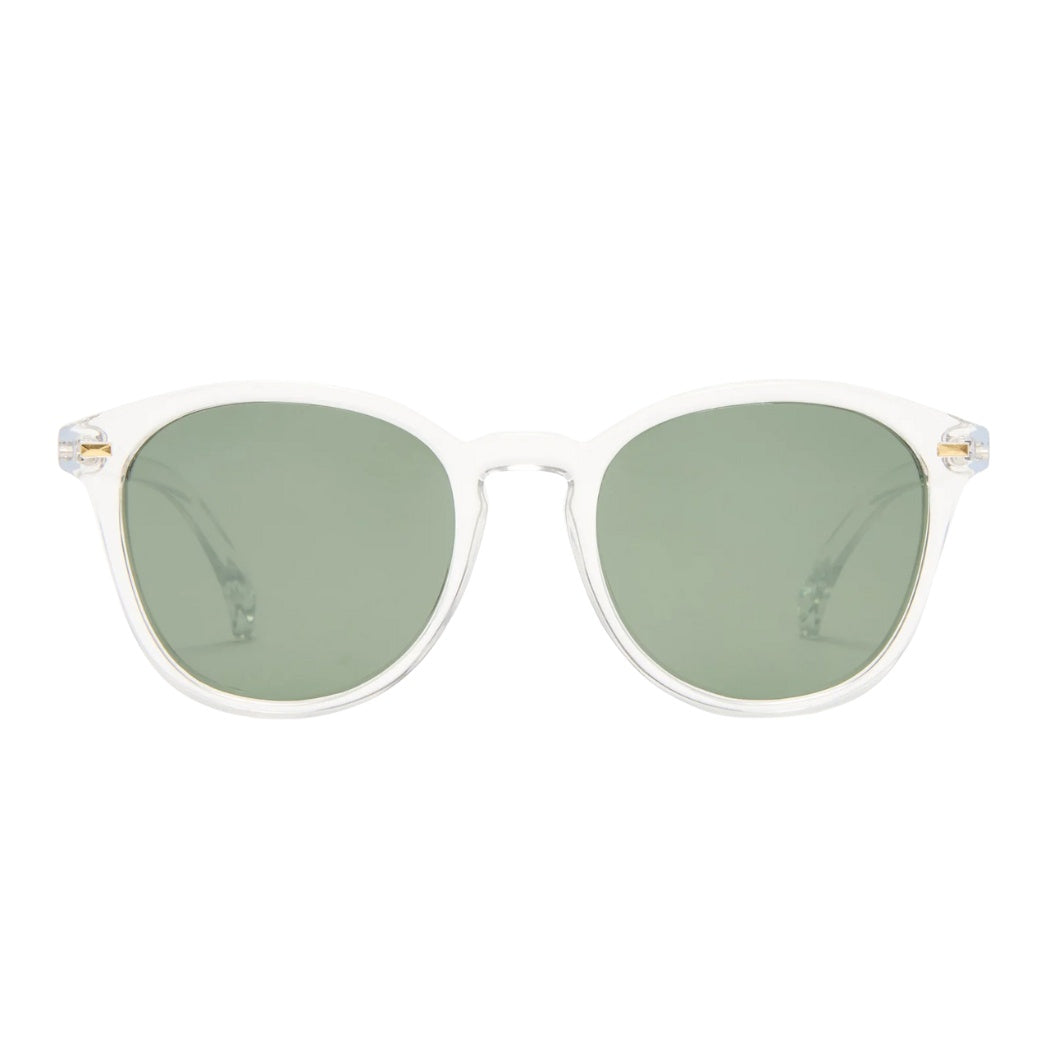 The Le Specs Bandwagon Crystal Clear are unisex eyewear. They blend vintage inspired details with modern functionality, making them the perfect all-around accessory. These sunglasses feature a keyhole nose bridge and refined angles, complemented by polarized lenses that eliminate unwanted reflective glare. The midsize frame boasts discreet metal rivet detailing and Le Specs' signature flagstripe metal hardware, ensuring a timeless and stylish look.