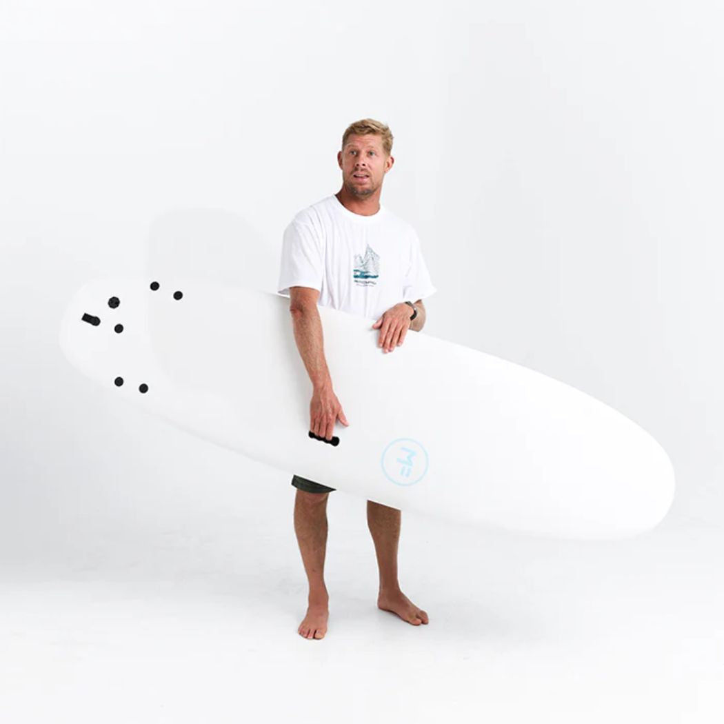 The MF 8'0 Beastie Supersoft Tri White Teal is a softboard. This is a fun board and is designed for surfers of all levels, offering a stable and user-friendly ride in a variety of conditions. Known for its generous volume and forgiving shape, the Beastie is ideal for easy paddling and catching waves, making it perfect for beginners or those looking for a fun board to take out on smaller surf days. With a soft outline and increased stability, this collection provides smooth turns and a balanced feel. Crafted with the precision and durability that MF Surfboards is known for, the Beastie surfboards offer performance and ease, making them a go-to choice for surfers seeking reliability and enjoyment in every session.