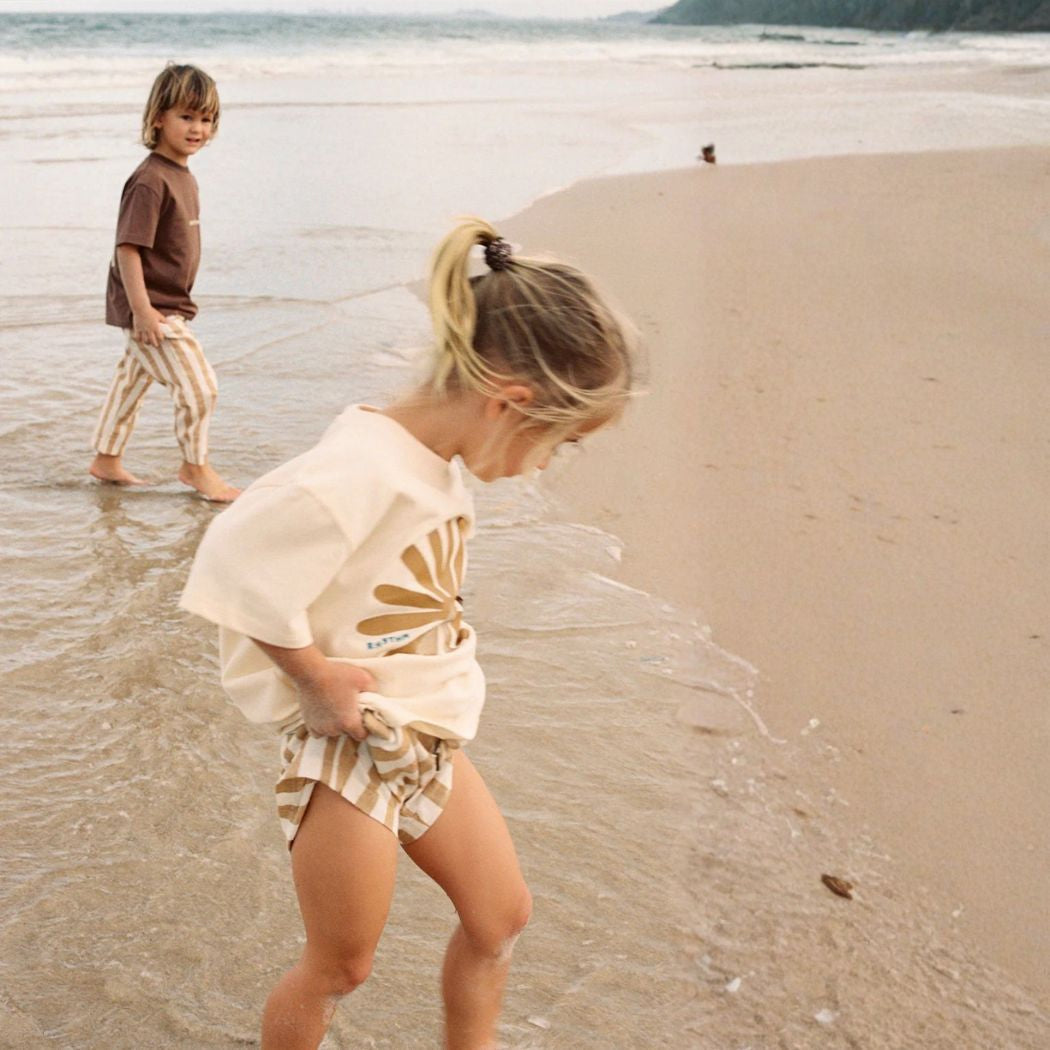 The Rhythm Kids Sun RA Tee Natural White is a kids t-shirt. It brings those easy summer surf vibes for the little groms who live for sun, sand, and sea. Cute, beachy, and comfy, this tee is made for all-day adventures — from building sandcastles to cruising with the family. Crafted from soft cotton with classic Rhythm branding. Let them be the coolest kid on the beach this summer.