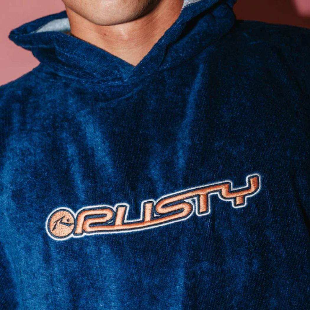 The Rusty Just Surfing Change Towel Navy Blue is a mens hooded towel. It is a soft cotton towel with an embroidered logo. Great pre surf check towel or post surf warm up. Dry off in this mens favourite.