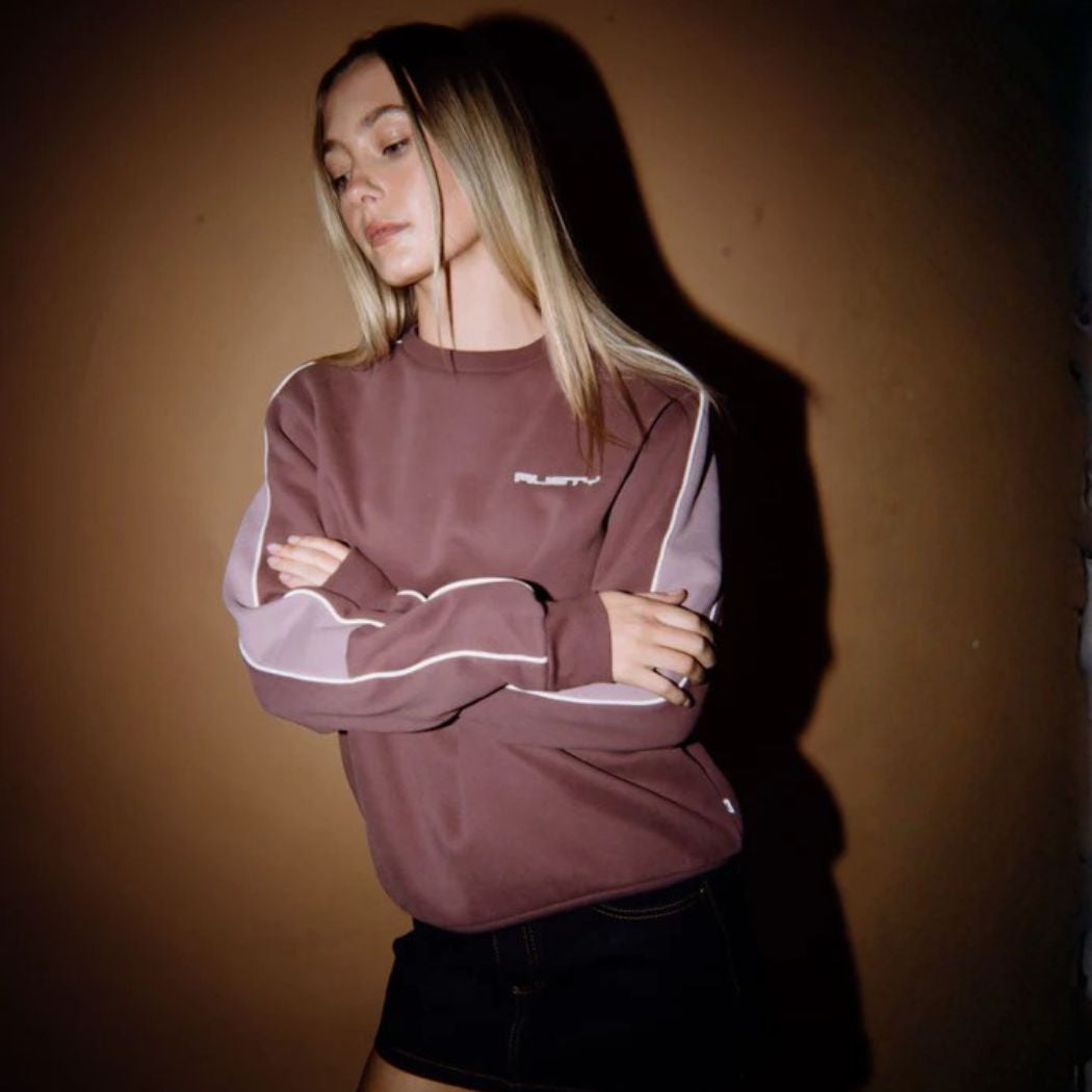 The Rusty Two Timer Panelled Crew Cadet Elderberry is a womens crew. Designed for easy comfort and laid-back style, this retro inspired crew is perfect for throwing on over your favourite tee when the weather cools down. The relaxed fit and retro panel look make it ideal for beach walks, skate sessions or casual days out, adding fun surf and street energy to any cool weather outfit.