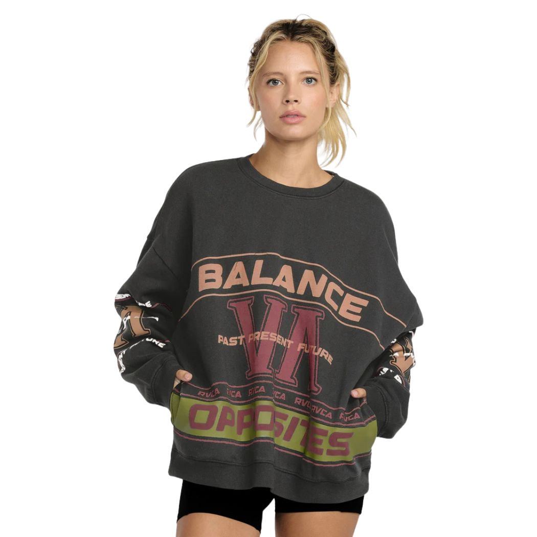 The RVCA Puck It Crew Washed Black is a womens jumper. It has that surfer-skater girl vibe with a bold oversized graphic and relaxed, slouchy fit. Perfect for throwing on after a surf or styling up for everyday hangs, this women’s crew layers easily with your favourite baggy jeans or cut-off shorts. Comfy, cool and full of RVCA attitude.
