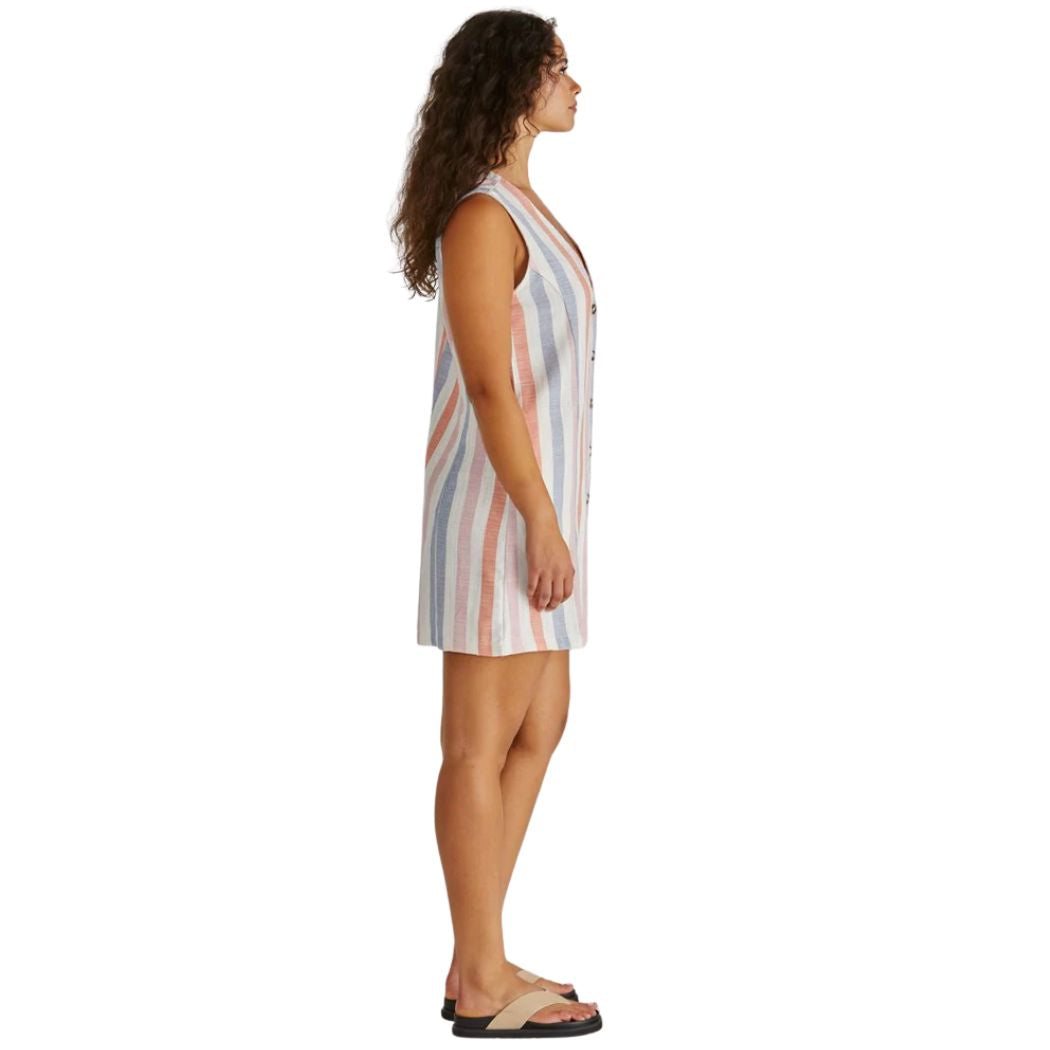 The Sass Travis Vest Dress Multi Stripe is a womens dress. It is a sleeveless button-down shift dress that’s easy to wear from morning to night. With its clean, relaxed silhouette and simple detailing, it’s a versatile piece perfect for all-day comfort or heading out for lunch with the girls. Lightweight and effortless, it’s an ideal addition to any wardrobe looking for a go-to dress that blends casual style with everyday ease.