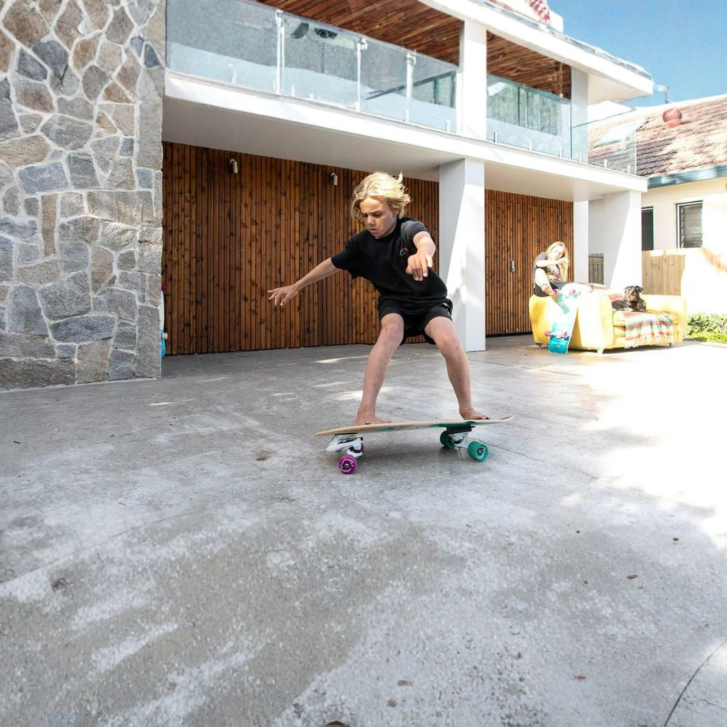 The Smoothstar 30 Flying Fish Purple THD (30 inch) is a surf skate surf trainer. It is the model for surf groms aged 9 to 12 years. It is designed to progress their surfing. Surfers of this age typically start to gain more confidence and gain strength in their body, so the Flying Fish is the perfect fit. It responds perfectly to body movement and mimics surf turns.