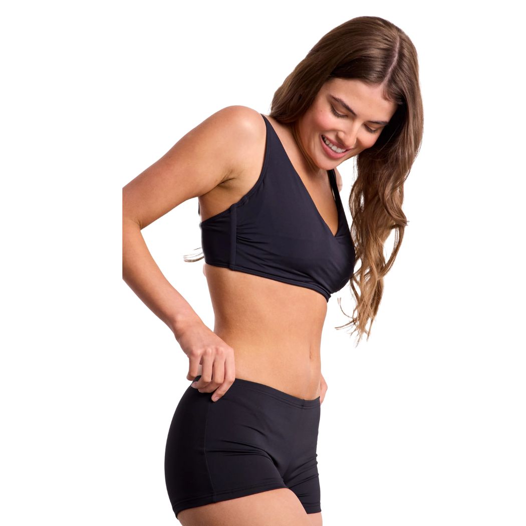 The Sunseeker Boyleg Pant Black are womens swim pants. Step into summer with style and comfort with the Sunseeker Boyleg Pant, a timeless swim bottom available in classic black. This essential piece features a clean lined boyleg cut that offers a flattering fit for all body types, ensuring you feel confident and comfortable. Its smooth, flat twin needle hem adds a touch of refinement to the simple yet elegant design. Whether you're lounging by the pool or enjoying a day at the beach, the Sunseeker Boyleg Pant is a must-have summer staple that combines comfort and style effortlessly.