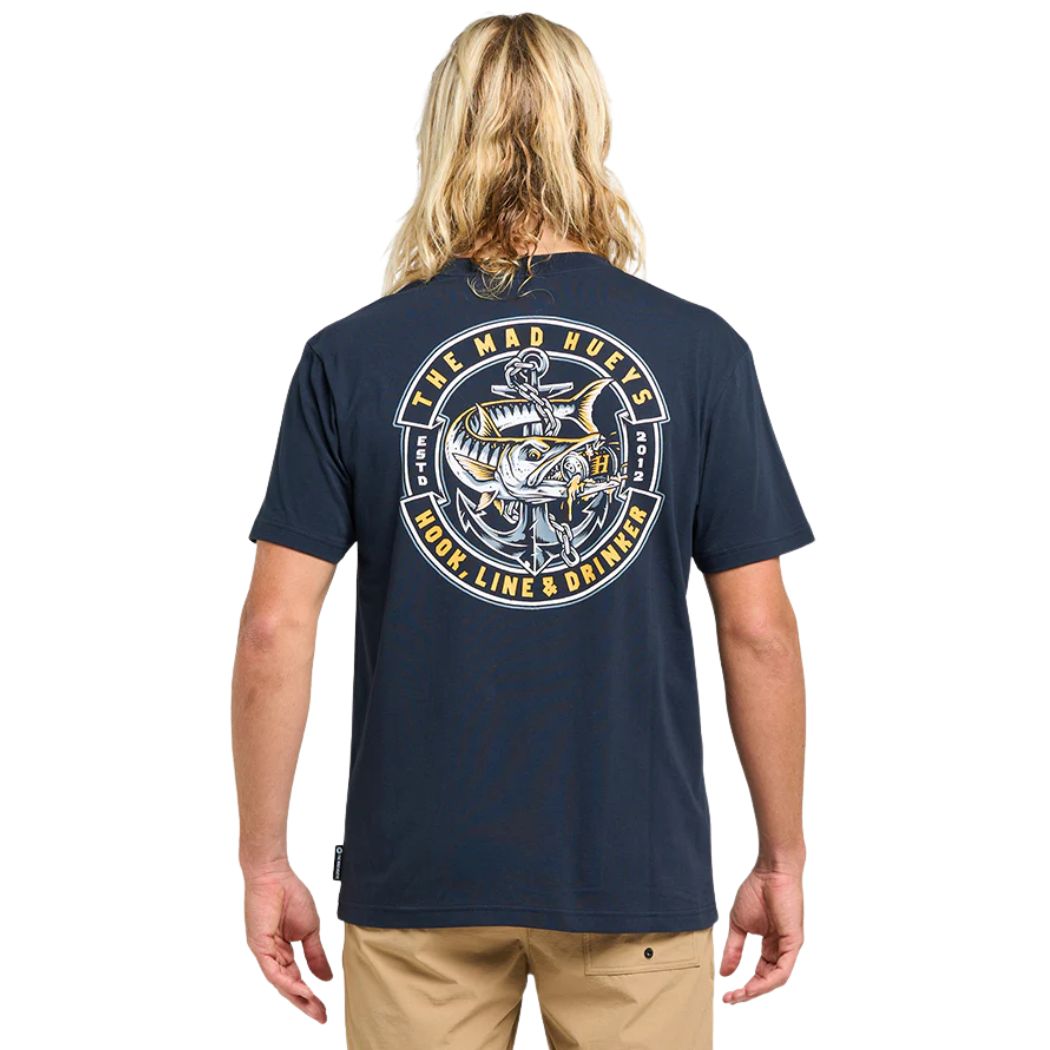 The Mad Hueys Hooked Cuda Tee Navy is a mens t-shirt. It is built for the crew who live for fishing, surfing, and raising hell on the water. Made with comfy cotton and cut for everyday wear, this tee is all about repping that salty lifestyle from the boat to the bar. With bold Mad Hueys graphics front and back, it’s a statement piece for legends who aren’t afraid to get hooked and stay wild.